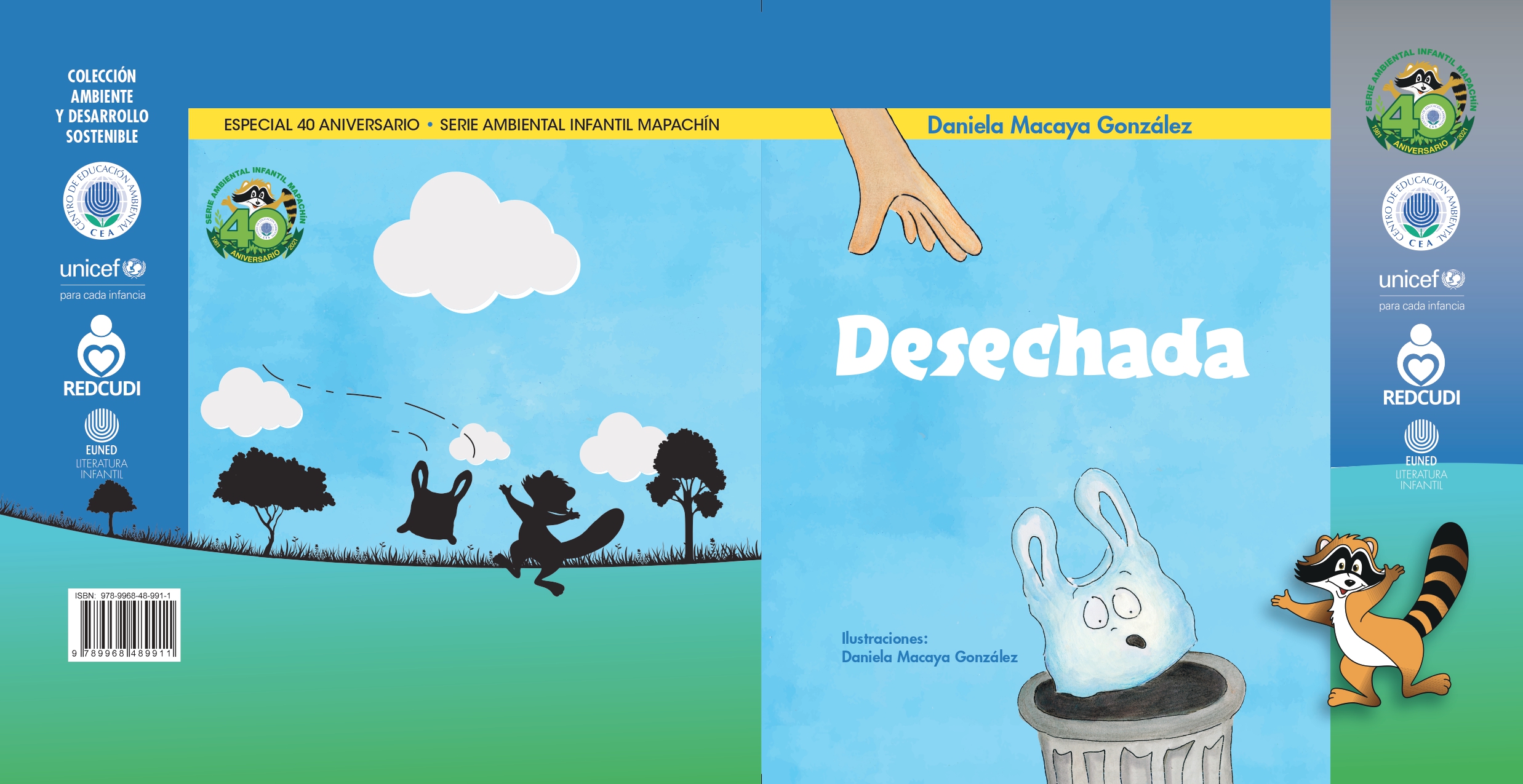 Desechada fue publicada este 2022 en alianza con UNICEF Costa Rica, quienes financiaron parte de la publicación y estarán donando libros a las redes de cuido del país, a fin de que la niñez se eduque acerca de la importancia de rechazar el plástico de un solo uso.