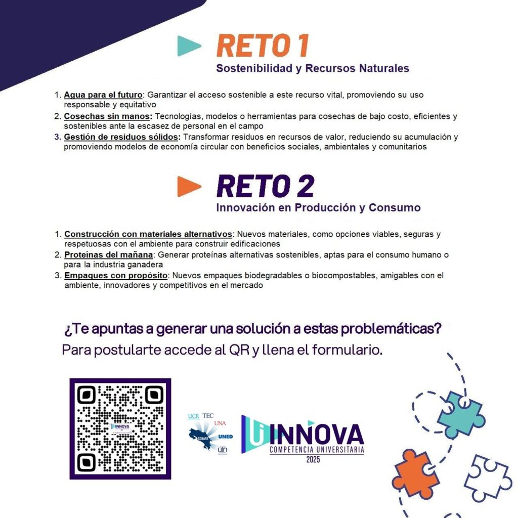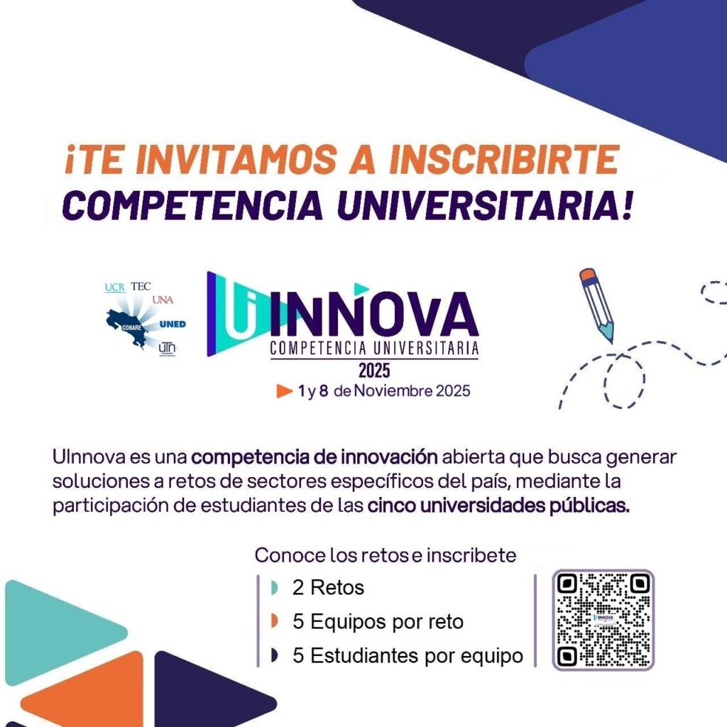 UInnova es una competencia interuniversitaria de innovación abierta que busca generar soluciones a retos propuestos por empresas, instituciones u organizaciones del sector productivo, mediante la participación estudiantil de las cinco universidades públicas del país. Su edición 2025 se llevará a cabo el 1 y 8 de noviembre mediante una modalidad híbrida.  ¡Todavía podés inscribirte!