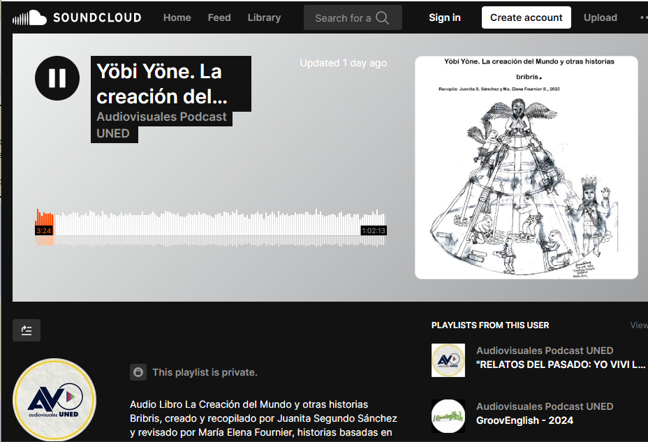 Puede escuchar Yöbi Yöne. La creación del Mundo y otras historias bribris en los enlaces en Soundcloud Audiovisuales UNED