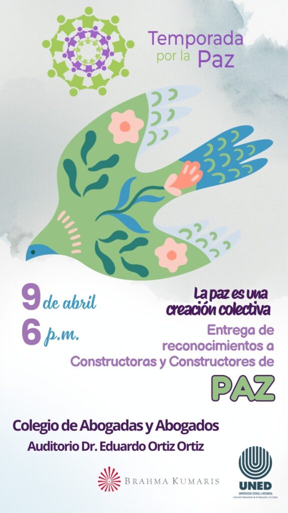 Gracias a Brahma Kumaris, la Paz se presentará en TransitArte, tendremos un taller con Colypro en Alajuela y, a manera de cierre, el 24 de abril en el marco de la Feria del Libro en Bagaces, se compartirán versos por la Paz y se realizará la premiación del concurso organizado por la UNED Cañas.