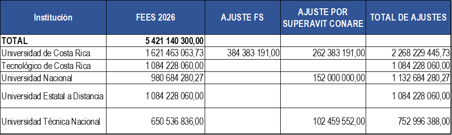 - Asignación de recursos adicionales al FEES a la Universidad de Costa Rica provenientes del superávit libre acumulado del CONARE, del Fondo del Sistema, de la Universidad Nacional y la Universidad Técnica Nacional por un monto de ₡646,9 millones.